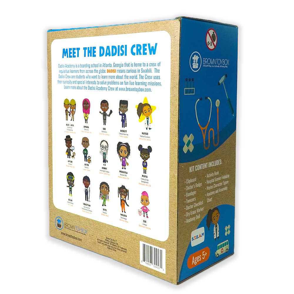 Medical Science STEAM kit. Kit features Dadisi Academy Crew member, Haylee. Kit includes Doctor checklist and clipboard, anatomy doll with removable organs, Haylee's healing band-aids, activity book, 3D doctor's office environment, and Haylee character cutout.