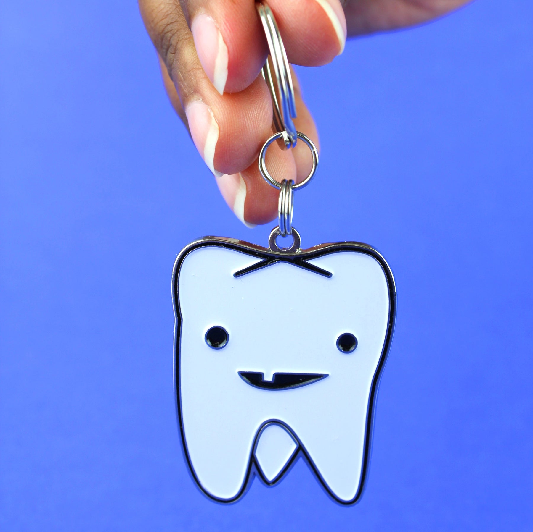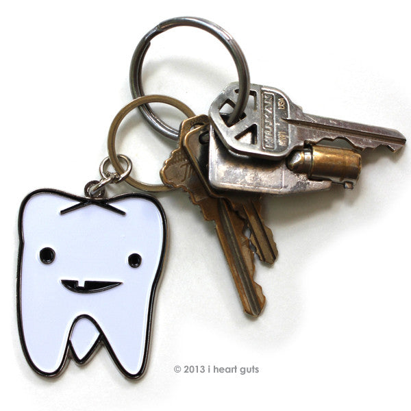 Our cute tooth keychain offers a gentle reminder to floss daily -- also, don't lose your keys. Oral surgery care packages need a happy smiling tooth keychain in there -- and look! -- our tooth has a tooth! Teeth keychains bring on the smiles for dentists and patients alike. Thank your dentist for all they do to make you smile. Cute dental hygienist gift!