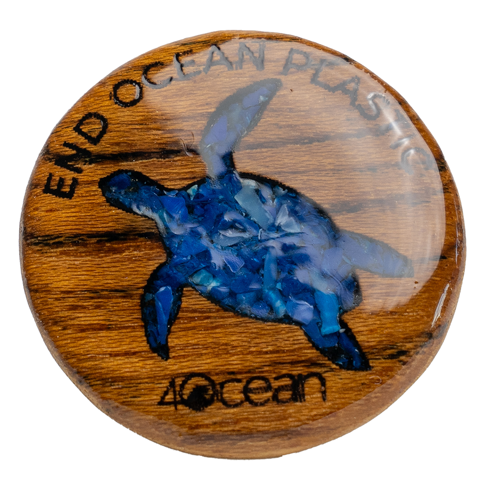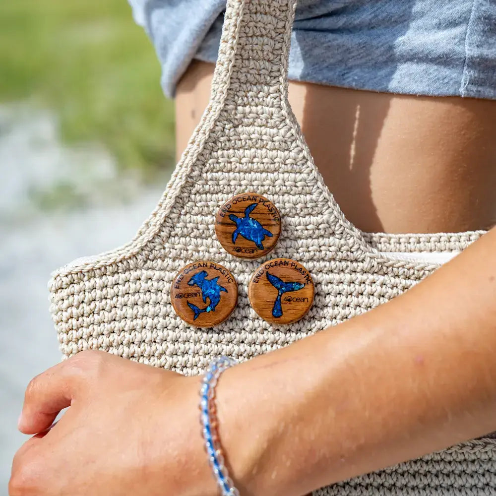 Introducing our handcrafted pins, made from microplastics pulled from the ocean, teak wood, and a plant-based resin. Each pin removes 5 pounds of ocean trash and helps offset the impact of single-use plastics that we find hard to avoid in our lives.