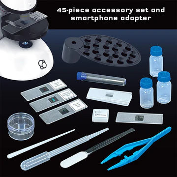 Travel deep into the microscopic realm! With this high-quality student microscope, Thames & Kosmos unlocks wonders of the world that are too small to see with the naked eye. Plus, the universal smartphone adapter lets you use your own smartphone camera to capture photos and videos of your observations to document and share. Start your journey by learning to use the microscope to view the three prepared slides. Then, learn how to use the 45-piece accessory set to prepare your own collected specimens for viewing under the microscope. What will you discover?